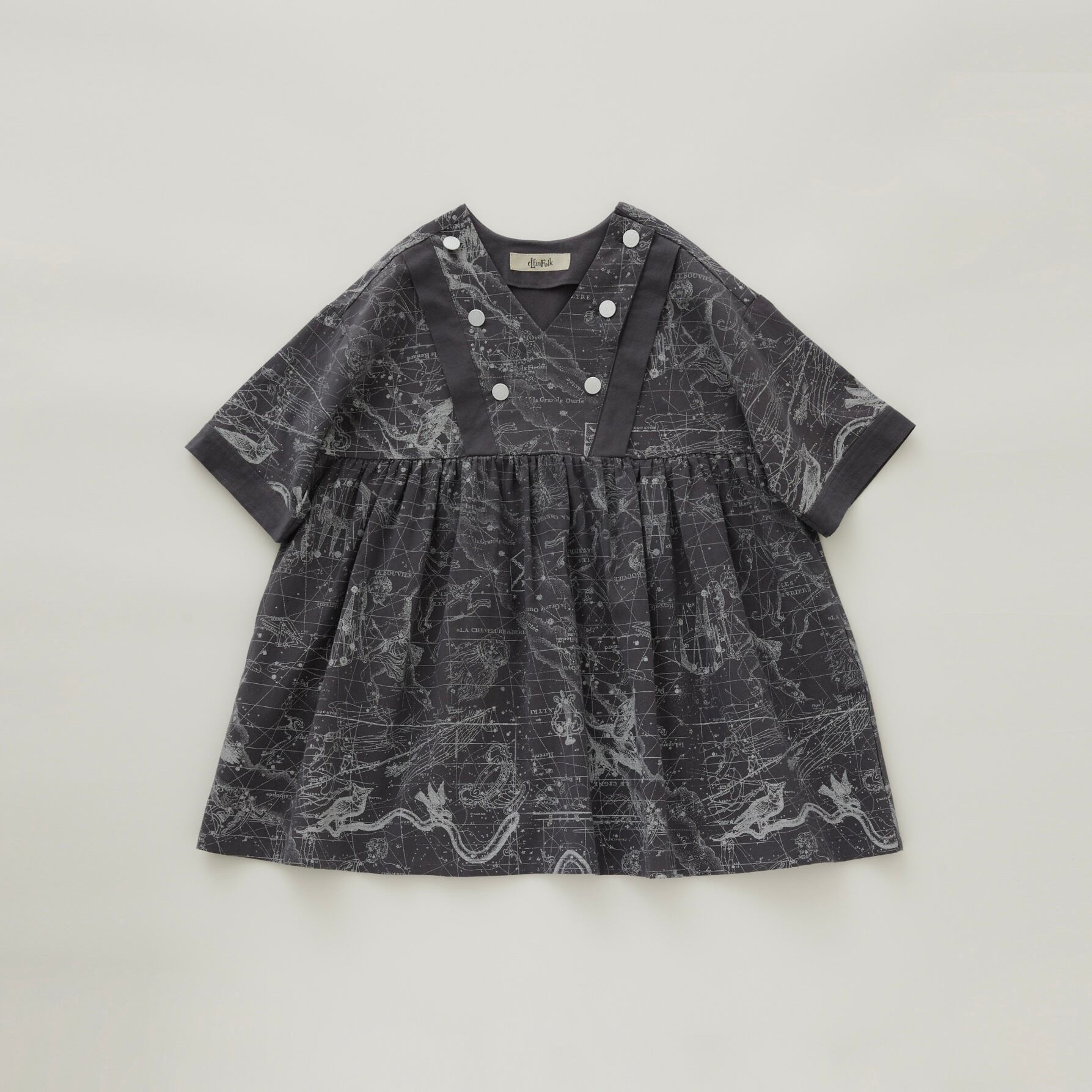 今シーズンのテーマ“幻のフクロウ座”の1800年代に描かれた古星図をコラージュした図案をプリントしたテキスタイルのドレス。